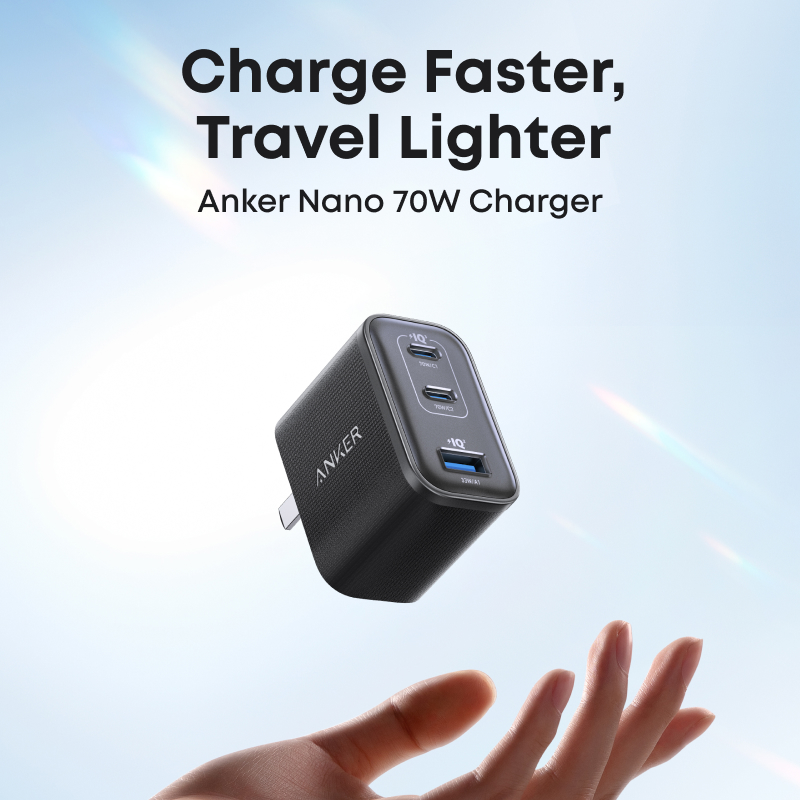 Hotel outlets, coffee-shop walls, co-working benches, the Anker Nano Charger 70W 3 Ports keeps a steady, low-profile connection where bulky bricks wobble. Despite having a compact and portable build, its ultra-stable slim design still powers up with 70W high-speed charging and supports backward compatibility with 67W and 65W devices.